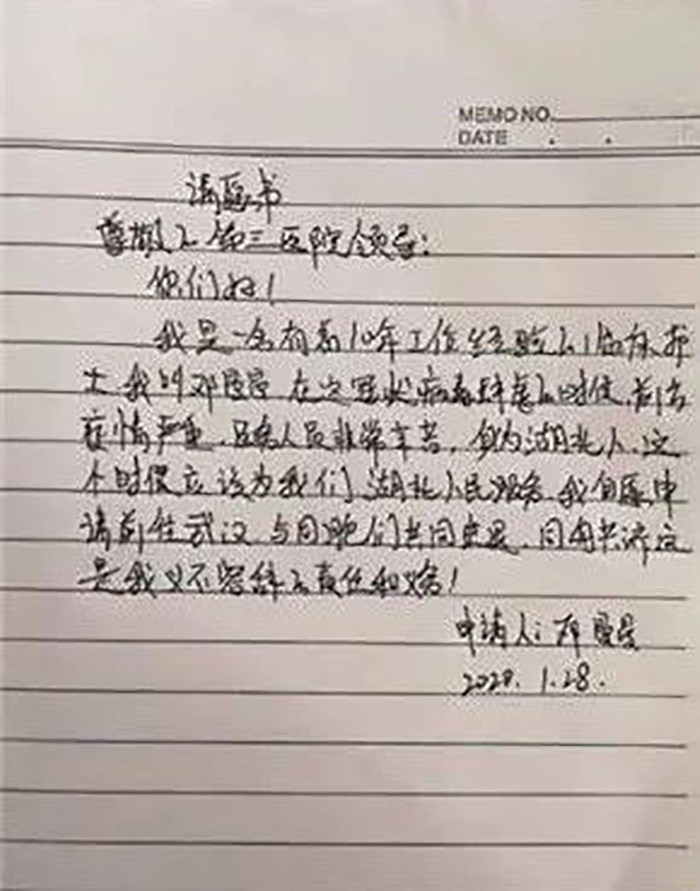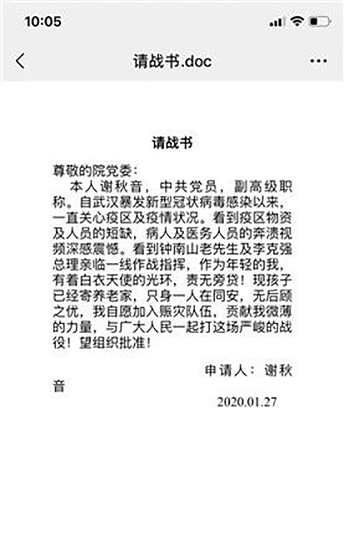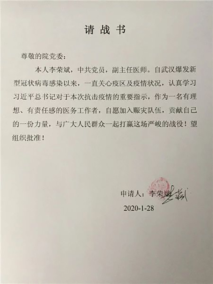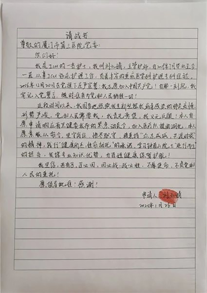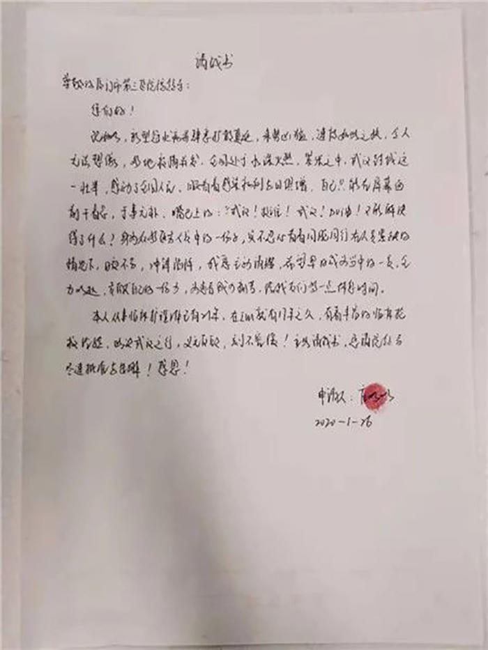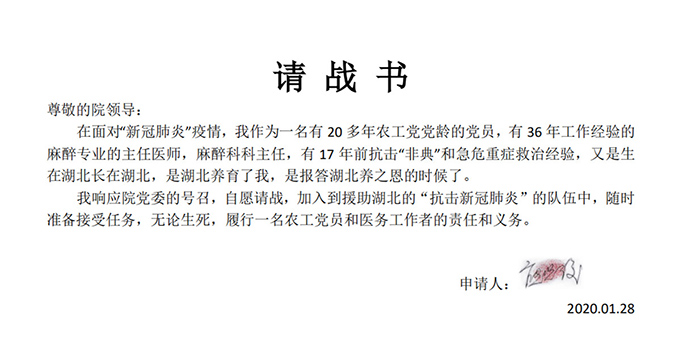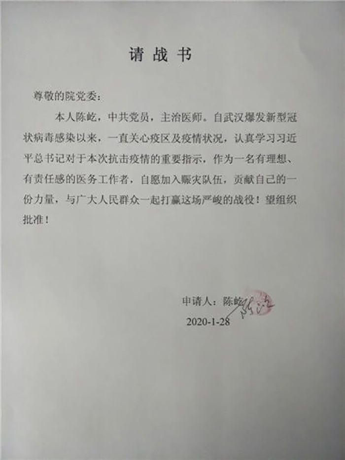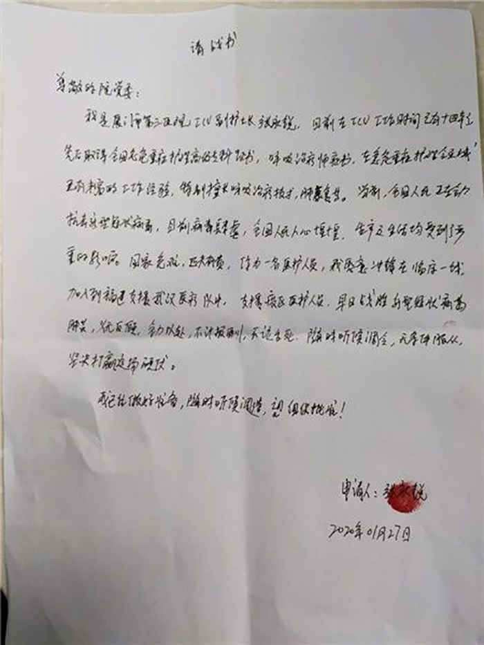 抗击新型冠状病毒肺炎防治党员先锋队”。 其实,孙竞群的母亲在不久之前刚做完动脉瘤介入手术,目前在家休养,妻子怀二胎也即将临盆,但家人仍支持他报名。“大宝懂事,也请了保姆,家里边的亲戚也能帮衬着,”孙竞群说,“救死扶伤是使命,希望能够前往武汉抗击疫情。” 一封封**书, 一个个鲜红的手印, 充分体现了三院党员、医护人员 在疫情面前众志成城、勠力同心、 共克时艰的战斗精神和医者情怀! 呼吸内科主治医师:张先锋 “我是一名医生,面对疫情,随时投入防控工作责无旁贷!”张先锋是51黑料
