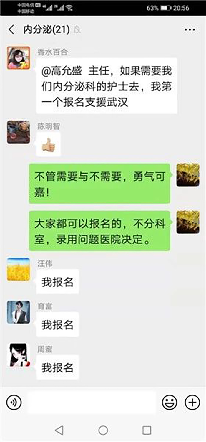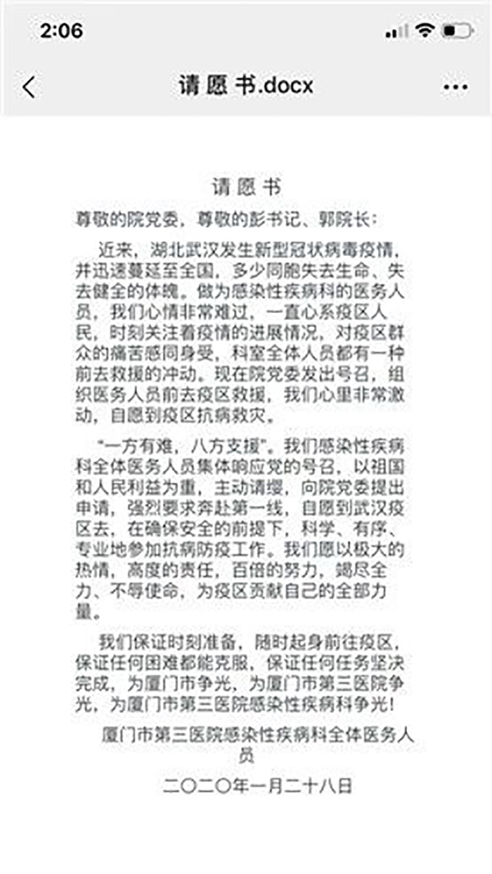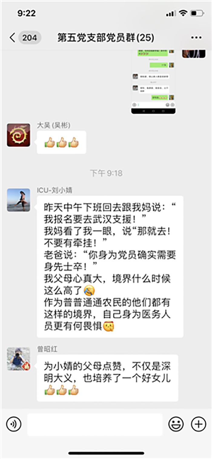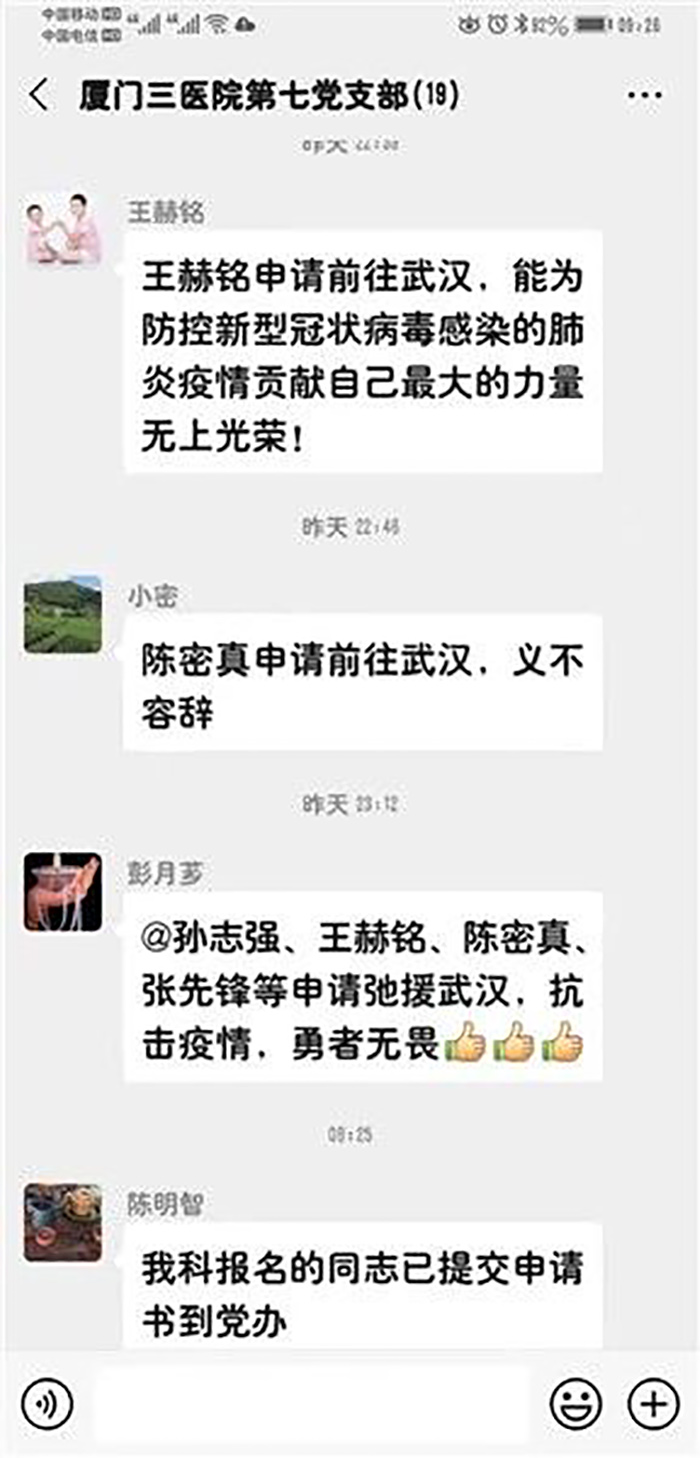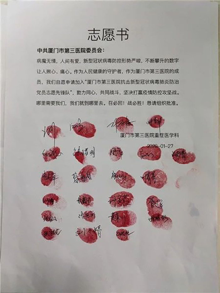 关于抗击新型冠状病毒感染肺炎疫情的倡议书》,医院各支部的党员干部医护人员,纷纷报名加入党员先锋队,发挥党员先锋模范作用,比如党员干部ICU主任吴彬、护士刘小婧;感染科护士陈惠娜;呼吸一科主任孙志强、护士陈密真;超声影像科副主任李荣斌、陈屹;急诊科主任王建;骨科主任医师孙竞群等均主动请缨,报名参与到抗击肺炎的战斗中去。临床一线医护人员,感染科主任马龙;呼吸二科主任卢晔;呼吸一科主治医师张先锋、护士黄亚红;呼吸二科护士长夏爱芳、护士陈艺芳;ICU主治医师吴资瑶,副护士长张永锐、护士庄吟吟;医学检验科副主任林燕平等,也都主动报名。