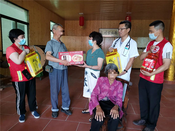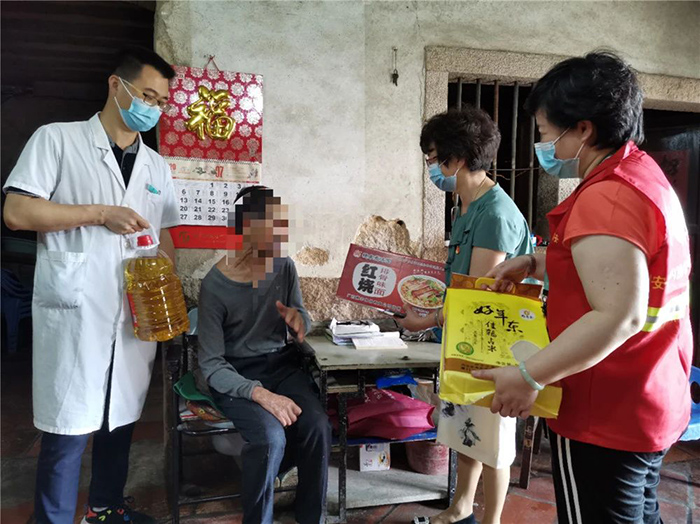 同时,三院的医护人员还入户为行动不便的老人体检,耐心、细致地询问老年患者用药情况、康复训练情况等,为贫困户送油、米等慰问品。