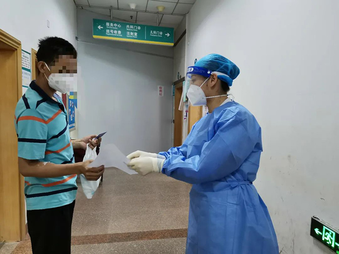 为避免患者及陪伴人员走错路,增加交叉传染风险,预检分诊处成立了专人组,“一对一”带领就诊人员前往目标诊室。“我们就相当于医院里面的导游,患者需要去哪里,我们就以最快速度引导他们去哪里,避免人员扎堆。”方文剪说,约20人的预检分诊团队,3班人员轮班,确保24小时在场高效、有序服务。
