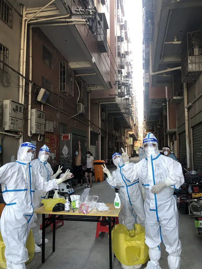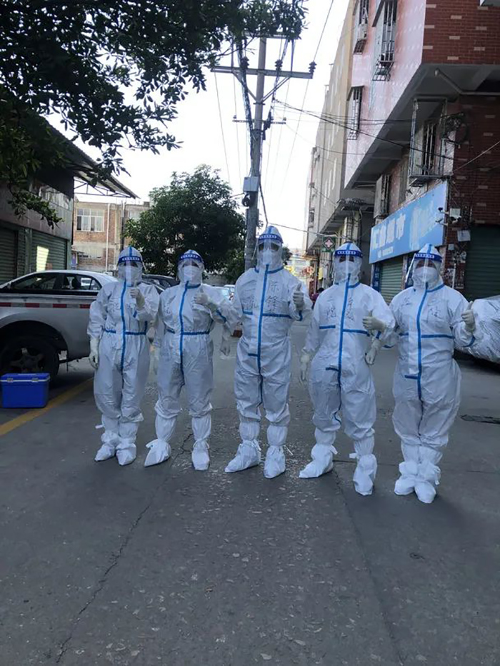 明知山有虎 ,偏向虎山行。医院党委书记彭月芗、党委委员、副院长黄建隆在疫情大暴发期还承担同安区疫情防控前方指挥部的全区常规检测小组、核酸混检阳性应急采样小组、重点区域核酸检测小组、溯源流调小组等重点任务,几天几夜,不畏艰险,联系各方力量,组织采样突击队转载作战,以最快的速度完成上级指派的各项应急采样任务,为市区疫情防控指挥部采取有效措施,阻断社区疫情外溢赢得宝贵时间。 9月14日深夜,党委委员、副院长黄建隆临时接到通知,迅速赶赴新民镇乌涂坝仔铺驻点指挥、协调重点人群核酸混检阳性应急采样任务,带领以苏春花为队长的应急采样队一直工作到第二天晚上7点多,连续作战21个小时,稍休息片刻又继续战斗。组织队员在封控重点区域进行扫楼,入户核酸采样,以顽强的大无畏精神,展现出一名**产党员在关键的时候站得出来,豁得出去的可贵精神。 “身着‘大白’,徒步前行,最难受的已不是从头湿到脚,而是在包得严严实实的防护服内,在感觉缺氧的情况下还要回答群众提出的问题。”作为第一支被派到新民镇进行核酸采样队伍中的一员,党员、消化内科医生蔡素芳,带着队友们,先后前往西塘、梧侣、乌涂等社区进行核酸采样,最后扎根坝仔埔,与苏春花应急采样队会合,共同做好混阳、密接者的核酸采样,他们是一支当之无愧的抗疫突击队。 蔡素芳说,由于临时受命前往高风险地区,短期内无法回家,大部分人所带换洗的衣物并不多,为了避免感冒,大家只能采取上阵一套衣、下阵一套衣的策略。彻夜奋战疲惫不堪,队友们竭力克服,直接“猫”在纸箱里睡觉……无论多累,大家都自觉互助,帮即将上场的队友把好关,看是否防护到位。无论多难,他们都未曾退缩,最终在深夜完成了任务。
