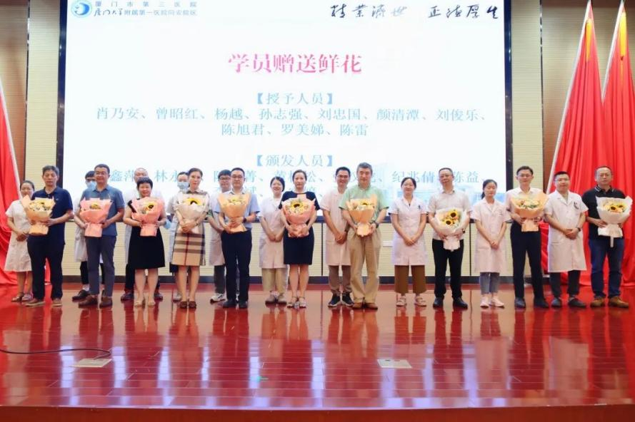 学员们为院领导、全科基地及教学部的老师们送上锦旗和鲜花,感谢他们3年来的栽培与照顾。