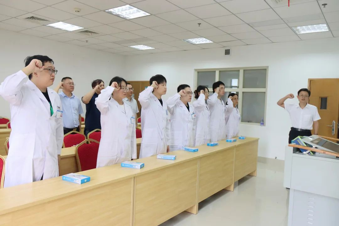 在副院长肖乃安的带领下,全体新学员右手握拳,庄严宣誓《中国医师誓言》。