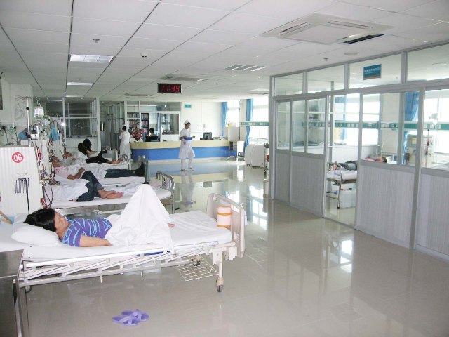 2011年6月9日,我院血液透析治疗室搬迁至二期病区大楼八楼肾内科病区,新建的血液透析治疗室严格按照卫生部标准进行建造,房间布局合理,符合院感规范。乙肝、丙肝患者专区、专机、专人负责。墙壁布控背景音乐、呼叫系统、自动调控透析床,富有人性化、个性化特征。床位编制16张,配有德国进口费森尤斯4008S血液透析机,日本进口的血液灌流机,空气消毒机、二级反渗水处理系统;新的血液透析治疗室设备先进、技术领先、与全球同步,能为重症肝炎、重症胰腺炎、急慢性肾功能衰竭等多脏器功能衰竭的病人赢得最佳抢救良机。
