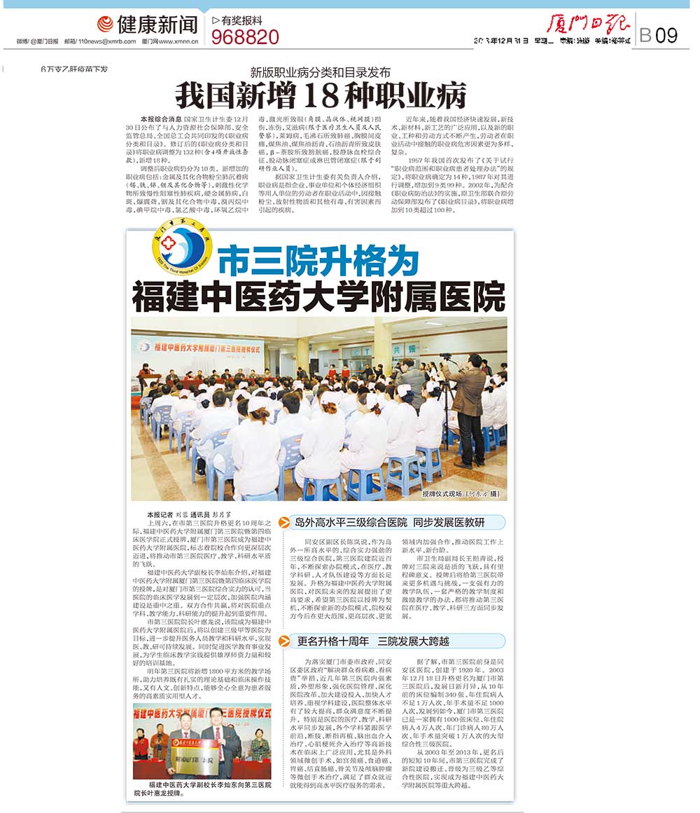 市三院升格为福建中医药大学附属医院