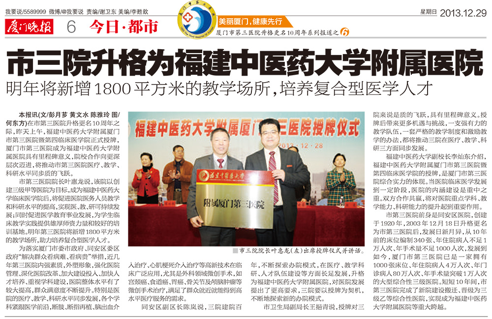 20131229晚报 报道6 市三院升格为福建中医药大学附属医院