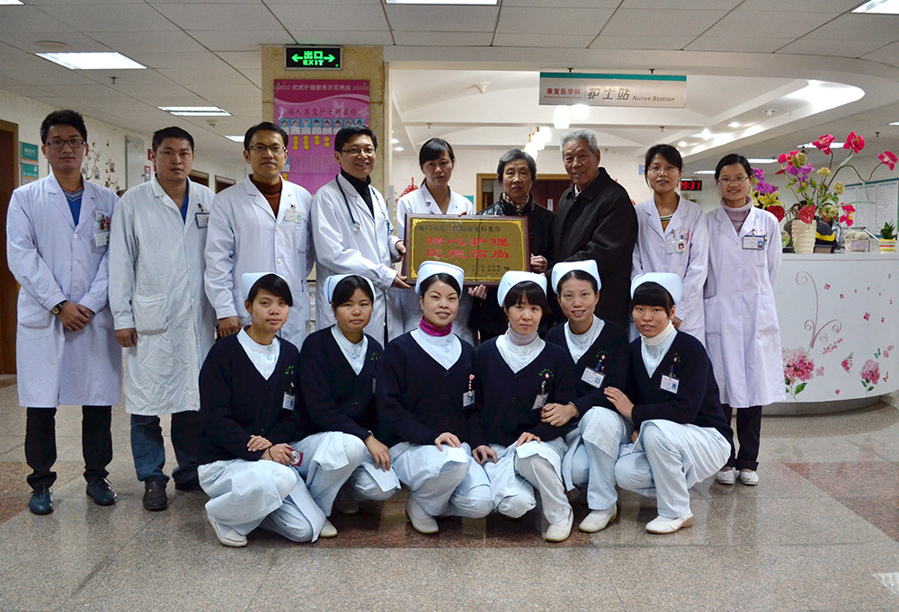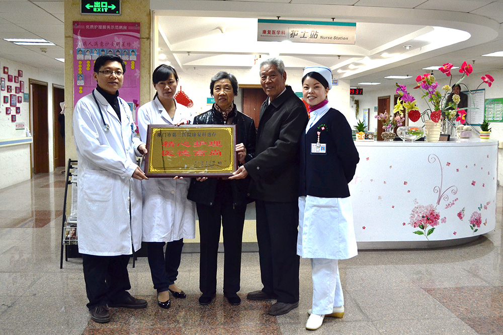 12月31日上午,康复科一位出院后的病人及家属特地送来一块牌匾,感谢康复科主任陈重捷带领下的医护人员给予精心治疗及护理。