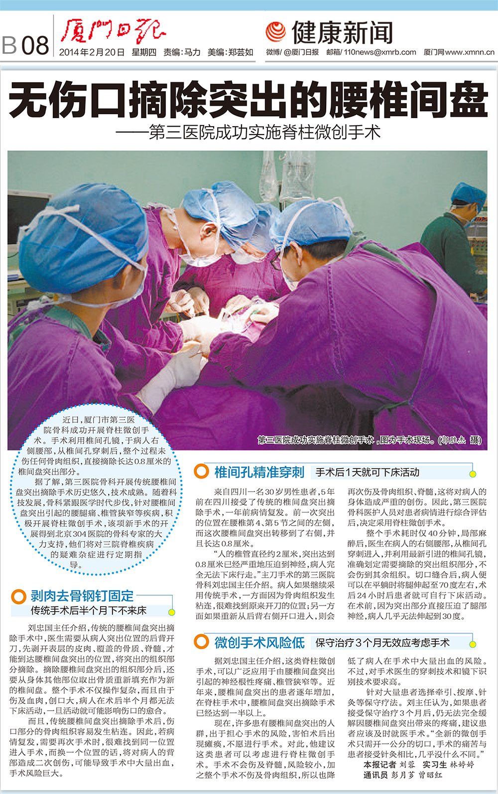 第三医院成功实施脊柱微创手术,无伤口摘除突出的腰椎间盘