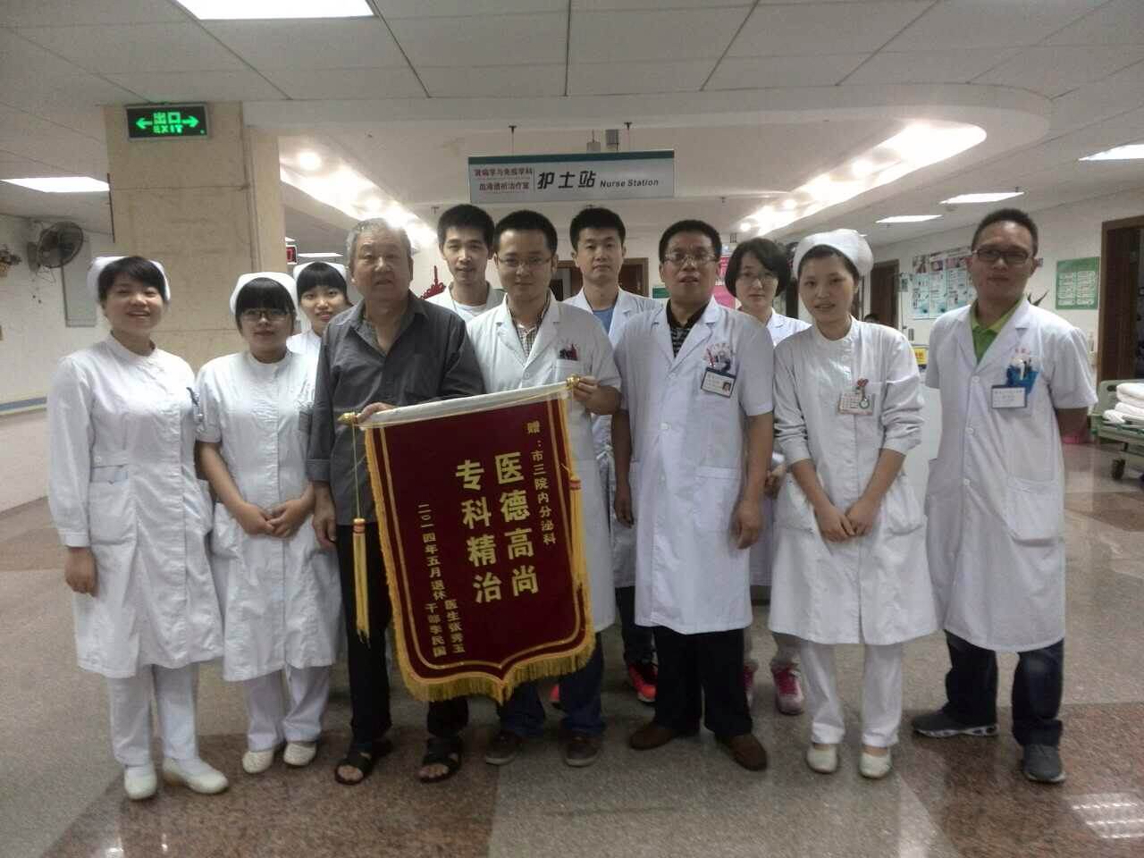 近日经人介绍,李民国老人到市三院内分泌科住院治疗,得到了内分泌科全体医护人员的悉心治疗和护理,老人家终于摆脱了每日注射四次胰岛素的痛苦。患者及家属万分感激,一大早冒着倾盆大雨,送上写着“医德高尚,专科精治”的锦旗到内分泌科,并与医务人员合影留念。