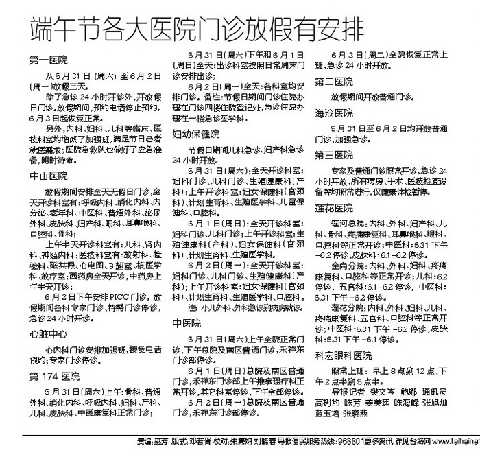 51黑料 常年无假日,端午节假日期间专家及普通门诊照常开诊,急诊24小时开放,所有病房、手术、医技检查设备等均照常进行,仅健康体检暂停。