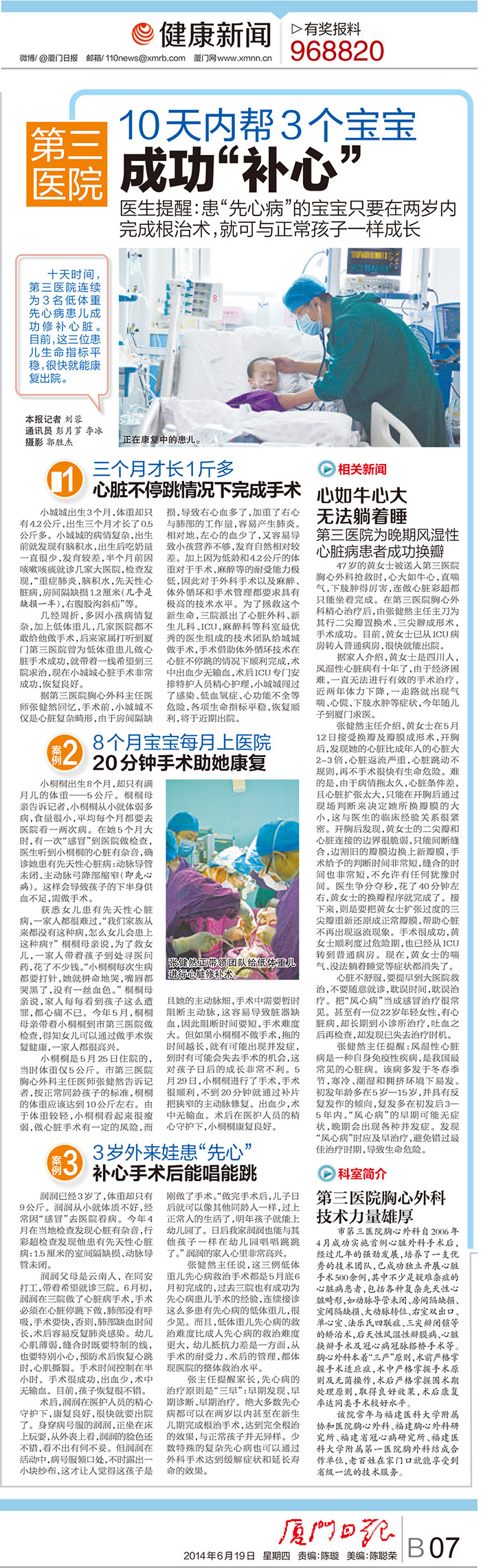 仅十天,第三医院连续为3名低体重先心病患儿成功修补心脏,其中最小的只有3个月,体重仅4.2kg,这在全国也是罕见的。目前,这三位患儿生命指标平稳,很快就能康复出院。