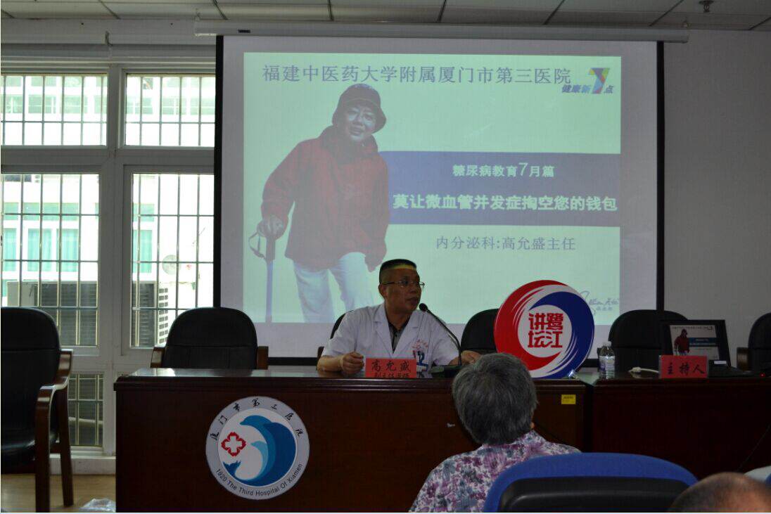 开坛,由市第三医院内分泌科负责人高允盛主讲《糖尿病并发症及其规范治疗》医学讲座,会议由第三医院院长助理、主任医师黄建隆主持。在院及门诊病人、社会群众及基层卫生院的医务人员等近200人参加听课。
