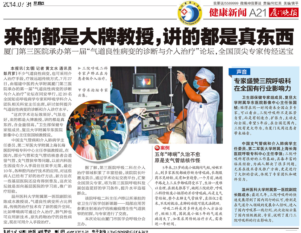 厦门第三医院承办第一届“气道良性病变的诊断与介入治疗”论坛,全国顶尖专家传经送宝