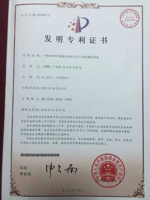 我院王顺旺医师发明的【MTHFRD基因多态性C677的检测试剂盒】获批专利