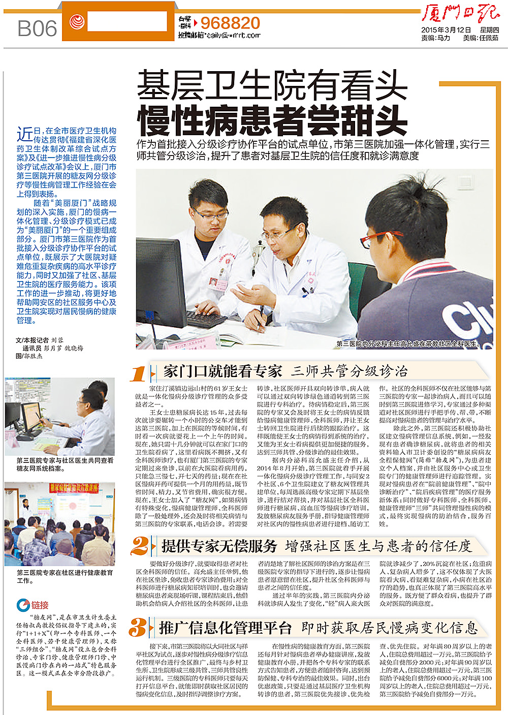 近日,在全市医疗卫生机构传达贯彻《福建省深化医药卫生体制改革综合试点方案》及《进一步推进慢性病分级诊疗试点改革》的会议上,厦门第三医院开展的糖友网分级诊疗等慢性病管理工作经验在会上得到表扬。