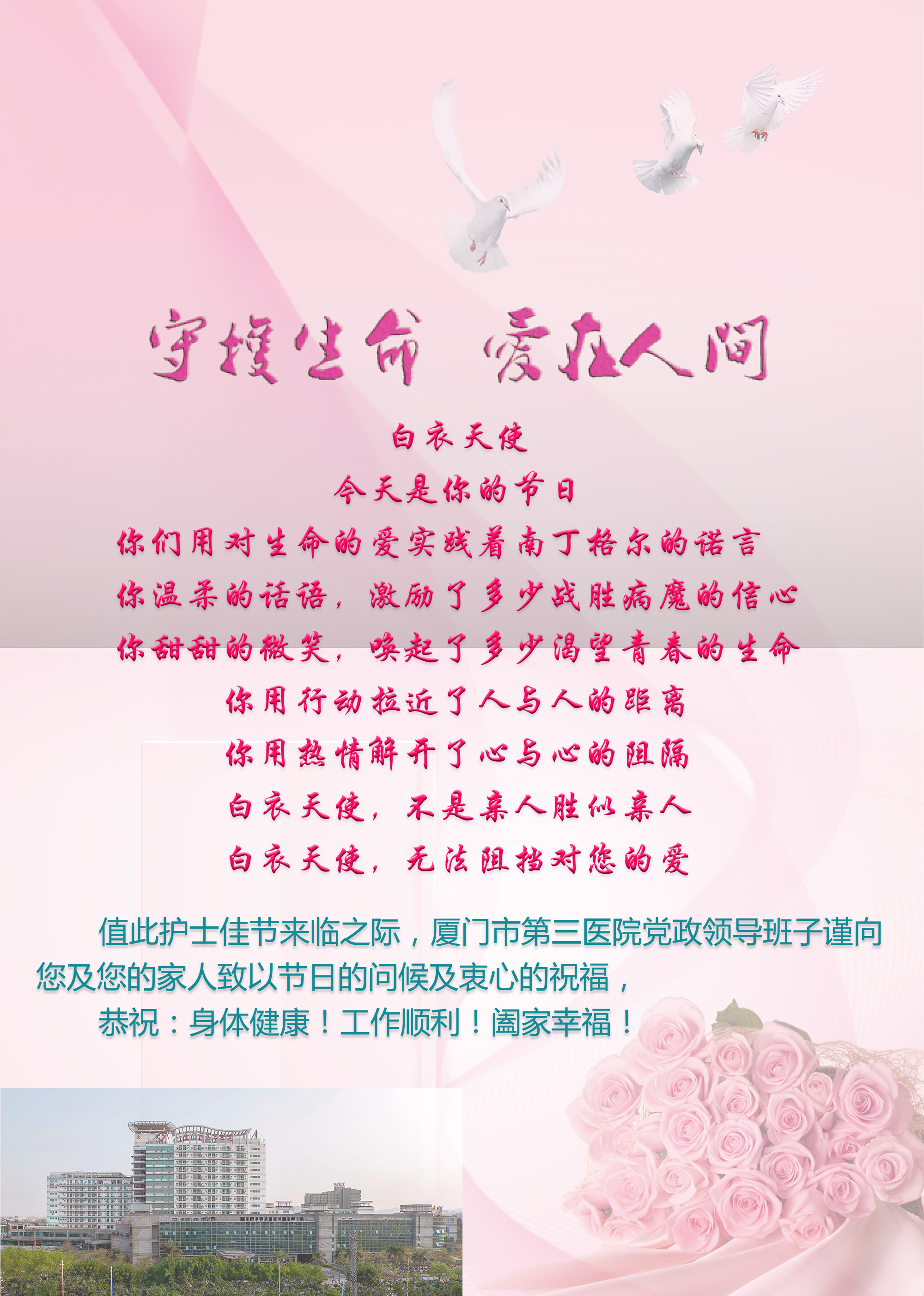 你的笑容,是健康的呼唤;你的无私,是平安的陪伴;护士,孕育着生命的希望;护士,给病人以蓝天;你们用微笑融化病人的伤痛,用耐心疏解病人的忧虑,用真心帮助病人康复,用青春抒写医疗事业的新篇章!你们是默默无闻的天使,你们是默默奉献的天使,祝所有护士节日快乐!