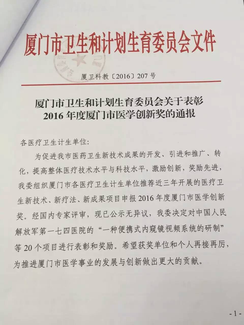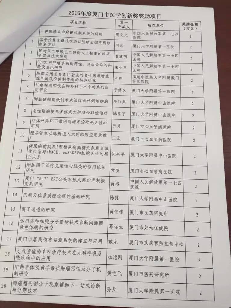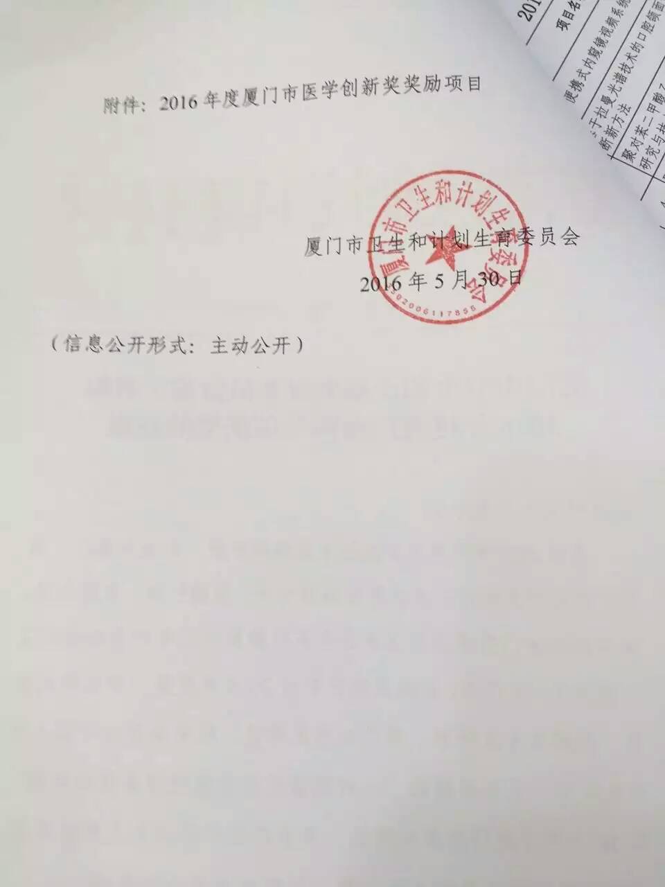 5月30日,第三医院呼吸二科主任卢晔的《局部应用苦参素注射液对良性瘢痕增生性气道狭窄抑制作用的初步研究》科研项目荣获2016年厦门市医学创新奖。