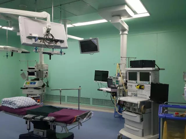 杂交手术室也叫复合手术室,具有百级层流,面积是普通手术室的2倍。手术室正中是一台可透光的全自动手术床,它可以一边检查一边手术。围绕在手术床边的是各式各样的高尖端仪器设备,如:体外循环机、实时心脏超声系统、麻醉机、呼吸机等,杂交手术室的核心设备是德国西门子数字平板DSA,身价高达1200万元,这台机器可在6秒钟内三维立体成像,把人体内的血管“地形图”显示在显示屏上,让医生做手术不再是“盲探”。