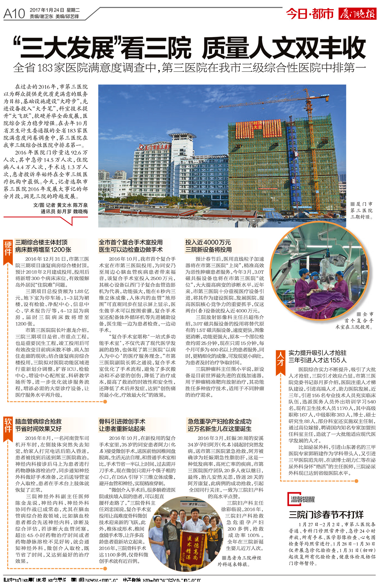 在过去的2016年,市第三医院以为群众提供更优质更满意的服务为目标,基础设施建设“大跨步”,先进设备投入“大手笔”,科室技术提升“大飞跃”,软硬并举全面发展,医院综合实力稳步增强,服务质量赢得广大群众的信任。在2016年10月福建省卫生计生委通报的全省183家医院满意度问卷调查中,第三医院在我市三级综合性医院中排名第一。