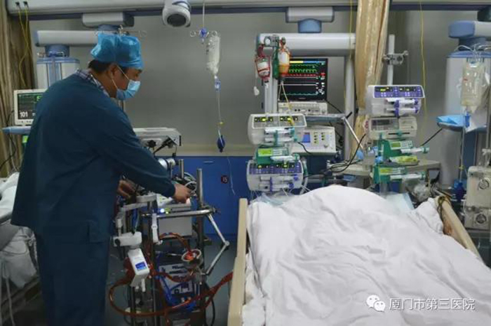 近日,三院还引进了体外膜肺氧合(ECMO)。这是一项重症医学专业中目前顶尖的生命支持技术之一,由于仪器先进、操作复杂,能增加患者救治成功机率,厦门开展此技术的医院寥寥无几。它还被称为叶克膜,即体外膜肺氧合技术,是通过建立体外循环,将患者血液引至体外,通过人工膜肺实现氧气和二氧化碳的体外交换,从而替代患者的肺脏甚至部分替代患者的心脏功能,能为心肺功能衰竭的患者提供强大的生命支持。主要适用于可逆性的心肺功能衰竭患者,尤其适用于严重ARDS、急性心肌炎等心源性休克的患者,是抢救危重症患者生命最重要的技术。