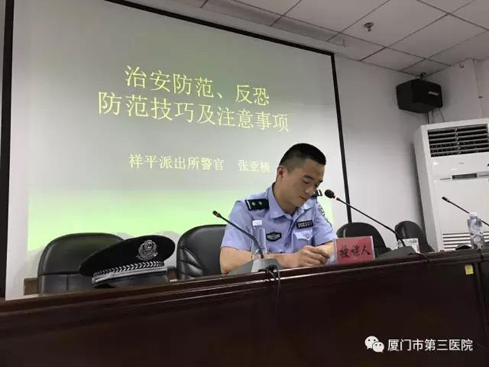 接着,祥平派出所警官张亚南结合医院工作实际,讲解治安防范、反恐防范技巧及注意事项。