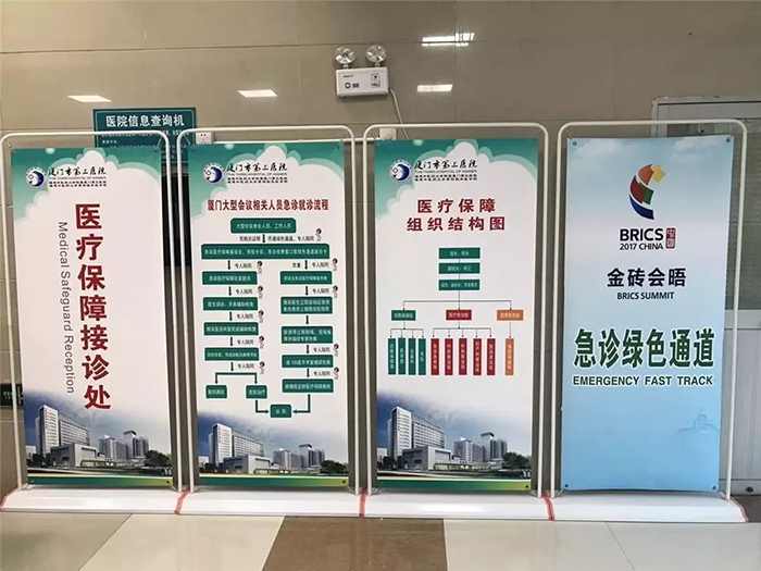 2、应急准备,充分有序。我院开通金砖会晤绿色通道,做到标识及标语醒目清晰。设立2017年厦门会晤医疗救治病区、门诊专区专用诊室、急诊抢救专用诊室,医疗保障专用收费窗口,医疗保障专用发药窗口,医疗保障专门的检验窗口等物资设备筹备工作,积极应对送至我院伤病员的救治。