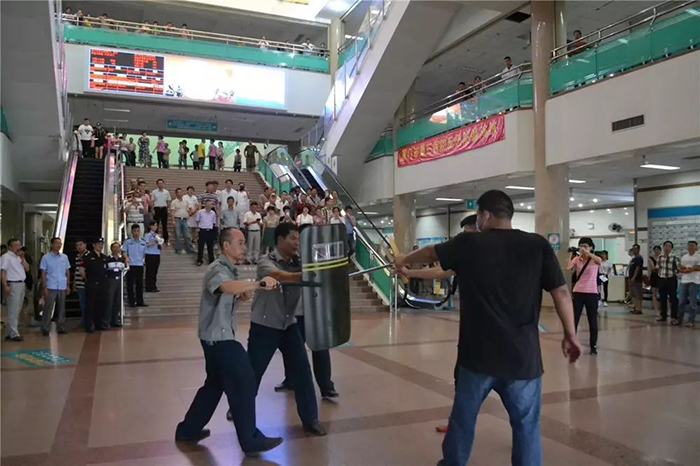2、开展反恐演练,提高处置能力。7月12日,医院会同祥平平派出所按照“二十秒到底案发现场,两分钟处置案件”的实战要求,在医院联合开展反恐防暴演练。按照预定方案,此次演练以两名暴恐分子持刀抢劫患者钱财为预设场景,医院工作人员发现案情后,立即按下一键式报警键,并及时向应急防暴队员救助。接到报警后,应急防暴队员快速反应,立即启动反恐应急预案,迅速集结警力赶到现场,并成功处置事件。演练中现场指挥得当,各小组分工明确,配合默契。参演人员听从指挥,沉着应对,达到了“二十秒到达案发现场,两分钟处置案件”的实战要求。