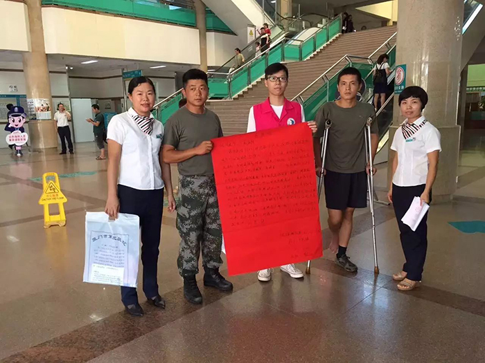 厦门会晤期间的一天上午,医院门诊大厅来了两名战士,其中一人手拄双拐,脚部肿胀,他们不熟悉就医流程,面露难色。叶意祥主动上前了解到,原来受伤的战士在安保训练中不慎崴到脚。叶意祥立即帮对方取票挂号,引导就诊,全程陪同。受伤战士做完检查时已经很迟了,取药、退卡等手续要到下午才能办理。天气炎热,受伤战士又行动不便,叶意祥将两名战士盛情邀请到自己家中吃饭休息,令两人感动不已。事后,受伤战士特意写来感谢信,称赞“第三医院志愿者服务真周到。”