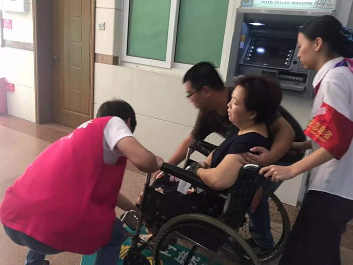 8月22日上午,一位阿姨被家人搀扶进门诊大厅,脸色发白,大汗淋漓,意识模糊,家属着急得不知所措。志愿者李志爽见状立即上前帮忙搀扶,配合导诊员将患者扶上轮椅,立即将患者送到急诊科就诊,为患者赢得了宝贵的救治时间。患者的病情逐渐稳定后,着急的家属也终于放下了悬着的心,激动地对医护人员和志愿者连声道谢。