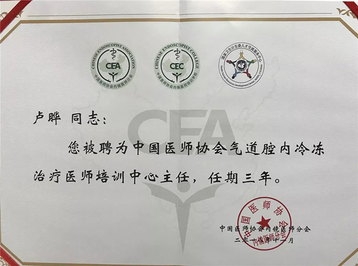 呼吸二科学科带头人卢晔主任在介入呼吸病学领域有较深的学术造诣和较高的学术影响,同时也被中国医师协会内镜医师分会聘为中国医师协会气道腔内冷冻治疗医师培训中心主任。