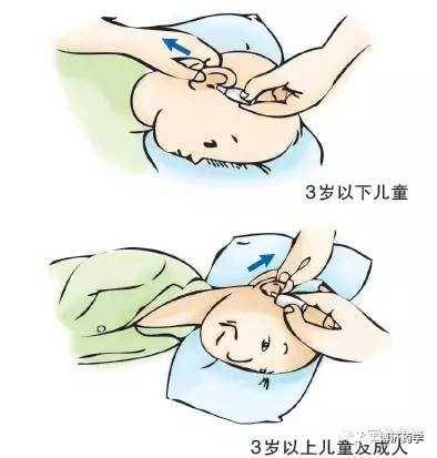 滴药时一般采取坐位侧偏头或侧卧于床上,患耳朝上,抓住耳垂拉向后上方(3岁以上儿童及成人)/后下方(3岁以下儿童),使耳道变直,滴管吸满药液,滴入规定滴数的药物。这样滴药可以使药液沿外耳道缓缓流入耳内。注意滴管不要触及外耳道壁,以免滴管被污染。